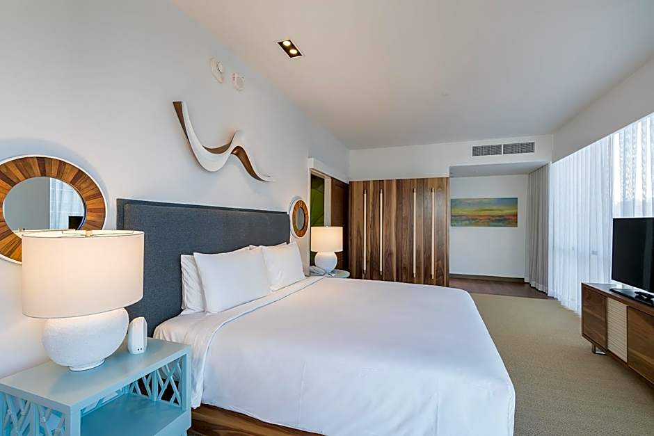 This room offers a flat-screen TV, a mini-refrigerator, an in-room Keurig machine, and floor-to-ceiling windows that highlight views of the ocean.